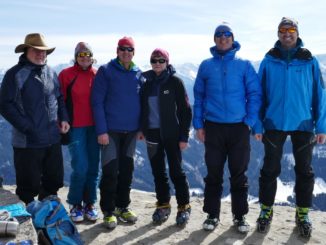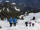Wir starteten zu acht in Kammeregg 1000 m nahe Kranzegg bei blauem Himmel und ca. – 5° um 9:00 Uhr Richtung Kammeregg Alpe 1130 m. Während der ersten 100 Hm bedurfte es pfadfinderischer Fähigkeiten, um die richtigen Schneisen mit ausreichend Schnee zu wählen. Ab der Alpe war die Schneedecke dann locker ausreichend und mit 10 cm Pulverschnee bedeckt. So zogen wir unsere Spur gemütlich hinauf zum Nordostrücken des Grünten und weiter zum Südostgrat des Gipfelhanges. Knapp unter 1700 m deponierten wir unsere Ski und zogen Grödel bzw. Steigeisen unter die Skistiefel, denn ein Ausrutscher wäre im steilen, eisigen und ausgesetzten Gipfelanstieg fatal gewesen. Nach Brotzeit und Panoramastudium stiegen wir wieder ab zum Skidepot und freuten uns bereits auf den vor uns liegenden Pulverschnee. Nach einer ganzen Reihe kaum verspurter Hänge kehrten wir ganz happy zum Abschluss auf der Terrasse der Kammeregg Alpe noch ein. Wir waren mit der Tour sehr zufrieden, trotz der nicht ganz einfachen Verhältnisse dieses Winters.