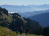 , sondern im sonnigen Süden laufen wir also auf einfachen Wegen zuerst zur Oberen Gelchenwangalpe, vorbei an herbstlich verfärbten Buchen und Bergahorn-bäumen, die zum blauen Himmel kontrastieren. Da die moderate Tour viel Zeit lässt, bleiben wir immer wieder stehen um das Bergpanorama zu studieren. In den Tälern Richtung Westen und Norden liegen die Nebel und darüber erheben sich u.a. Säntis und Schesaplana, sowie natürlich die gesamte Kette der zentralen Allgäuer Alpen. Weit nach Westen ausholend steigen wir dann zum Gipfelkreuz des Hochgrat empor. Nachdem wir am Gipfel im T-Shirt sitzend die wärmende Sonne genossen haben