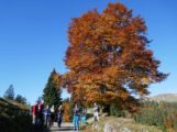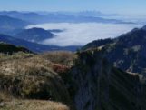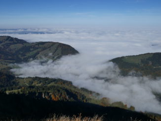 , sondern im sonnigen Süden laufen wir also auf einfachen Wegen zuerst zur Oberen Gelchenwangalpe, vorbei an herbstlich verfärbten Buchen und Bergahorn-bäumen, die zum blauen Himmel kontrastieren. Da die moderate Tour viel Zeit lässt, bleiben wir immer wieder stehen um das Bergpanorama zu studieren. In den Tälern Richtung Westen und Norden liegen die Nebel und darüber erheben sich u.a. Säntis und Schesaplana, sowie natürlich die gesamte Kette der zentralen Allgäuer Alpen. Weit nach Westen ausholend steigen wir dann zum Gipfelkreuz des Hochgrat empor. Nachdem wir am Gipfel im T-Shirt sitzend die wärmende Sonne genossen haben