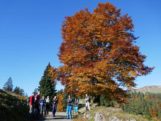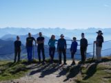 , sondern im sonnigen Süden laufen wir also auf einfachen Wegen zuerst zur Oberen Gelchenwangalpe, vorbei an herbstlich verfärbten Buchen und Bergahorn-bäumen, die zum blauen Himmel kontrastieren. Da die moderate Tour viel Zeit lässt, bleiben wir immer wieder stehen um das Bergpanorama zu studieren. In den Tälern Richtung Westen und Norden liegen die Nebel und darüber erheben sich u.a. Säntis und Schesaplana, sowie natürlich die gesamte Kette der zentralen Allgäuer Alpen. Weit nach Westen ausholend steigen wir dann zum Gipfelkreuz des Hochgrat empor. Nachdem wir am Gipfel im T-Shirt sitzend die wärmende Sonne genossen haben