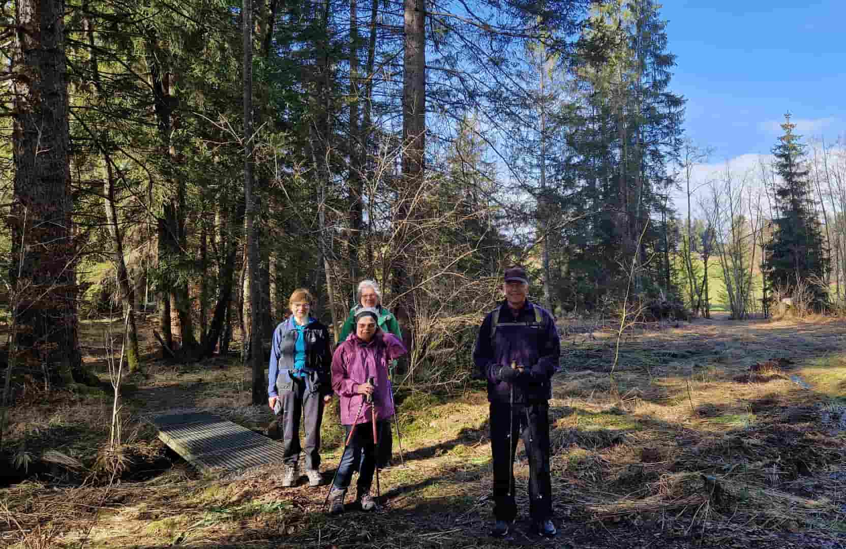 Geplant war eigentlich eine knackige Winterwanderung mit Frost und viel Schnee, doch die Wettermacher lieferten fast warmes und teilweise sonniges Frühlingswetter. Der Winter ist halt auch nicht mehr so richtig planbar. So wanderten wir gemütlich vom Roßhauptener Wettebad nach Nordwesten zwischen Stockachbichel und Wasenmoos über den Brettlesweg zu einem Brückerl ins Tal der Schmutter. Am anderen Ufer ging es nun nach Osten unterhalb der Kellerhalde vorbei am Trinkwasser Reservoir zum einsamen Jägerhäusl. Hier schwenkten wir nach Süden und stiegen über mittelsteile Hänge zum Gipfel des Fahrenbergs. Beim Gipfelbucheintrag waren wir mächtig erstaunt, dass den ersten Bucheintrag vor Jahren unser Bernhard Lippert geschrieben hat. Nach einer flinken Brotzeit mit Panoramabestimmung ging es nun durch die Hölle hinunter Richtung Riedle und zurück zum Wettebad. Dort öffnete sich ein Kofferraum für´s „Tischlein deck dich“ mit Krapfen und Glühwein. Nach Stärkung und Ratsch ging es dann wieder zufrieden nach Hause.