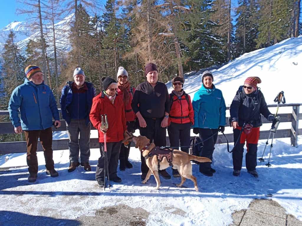 Wie seit vielen Jahren haben wir wieder unsere traditionelle Winterwanderung auf die Stablalm unternommen. Die 10 Teilnehmer und Hund Poldi trafen sich um 9.00 beim Holler und fuhren gemeinsam nach Elmen ins Lechtal. Das Wetter hätte schöner nicht sein können – strahlender Sonnenschein – keine Wolke am Himmel. Die Temperatur war recht frisch – minus 9,5 Grad beim Start. Alle waren sich einig: wir wandern gemächlich mit einigen Pausen, wie es „Genusswanderer“ zusteht, und waren trotzdem in 1 ¾ Stunden oben. Auch auf der Stablalm war Personalmangel – wie derzeit in vielen Gaststätten. Die Wirtin und ihr Mann mussten zu zweit Küche und Bedienung stemmen. Dadurch war die Speisekarte entsprechend reduziert – keine Ripperl