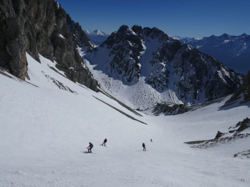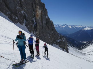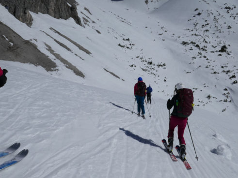 Als wir mit den Marienbergliften bei Biberwier zum Marienbergjoch auffahren ist jeder froh, der vorher seine Daunenjacke angezogen hat. Wieder ist ein strahlender Tag angebrochen. Ein Tourentag wie aus dem Bilderbuch mit Sonne pur und deutlichen Minusgraden. Lawinenwarnstufe 1, was will man mehr. Vom Marienbergjoch steigen wir nach Osten durch das Latschengelände des Arzbödele, unterhalb der Südwände des Grünsteins zum Hölltörl auf, wobei die Harscheisen den Anstieg erleichtern. Hier oben laufen wir schon im strahlenden Sonnenschein und blicken zurück auf die Lechtaler Alpen und hinab ins Inntal, über dem die Ötztaler Alpen herüberleuchten. Vom Hölltörl schwingen wir im Firn durch das Kar ca. 300 Hm hinunter, bei idealer Neigung in die sogenannte Höll. Dieser Ort hat seinen Namen wohl aufgrund der schroffen Kalkwände, die sich hier zu allen Seiten aufsteilen. Wir können hier von Hölle aber nichts wahrnehmen, da wir in der wärmenden Sonne auffellen und über den Felswänden der blaue Himmel strahlt. Nun steigen wir nach Norden die Höllreise hinauf. Ein weites immer steiler werdendes Kar, das schon zur Hölle werden kann, wenn man hier später im Jahr in der Mittagshitze aufsteigt. Auch wir spielen mit dem Gedanken noch eine Schicht auszuziehen, als der zurzeit übliche Ostwind für Kühlung sorgt. Durch dieses Kar erreichen wir die Grünsteinscharte, mit 2272 m der höchste Punkt unserer Tour. Da auf der steilen Nordseite, die wir hinab müssen, abgeschabtes, felsdurchsetztes Gelände ansteht, tragen wir die Skier einige Höhenmeter hinunter, um dann erst unter den Nordabstürzen der westlichen Griesspitze Richtung Tajatörl hinüber zu queren. In kurzer Zeit ist dann bequem das Tajatörl erreicht, wo wir Hans und Anni treffen, die über das Brendlkar aufgestiegen sind. Nach der verdienten Brotzeit fahren wir durchs Brendlkar ab, immer auf der Suche nach unverspurtem Pulverschnee, bis wir das Liftgebiet von Ehrwald erreichen. An der Talstation in der Brent Alm beschließen wir mit Apfel- und Topfenstrudel diesen ausgefüllten Tourentag, um dann mit dem Bus nach Biberwier zurück-zukehren.