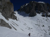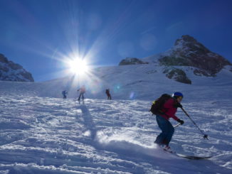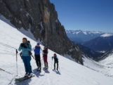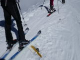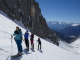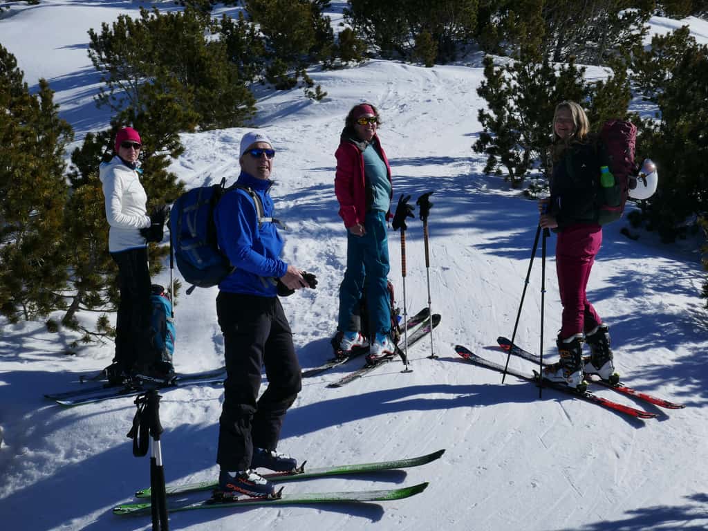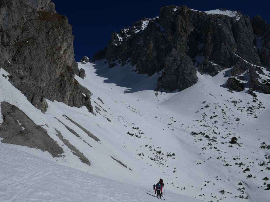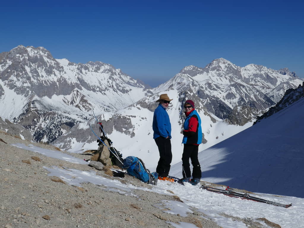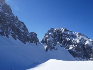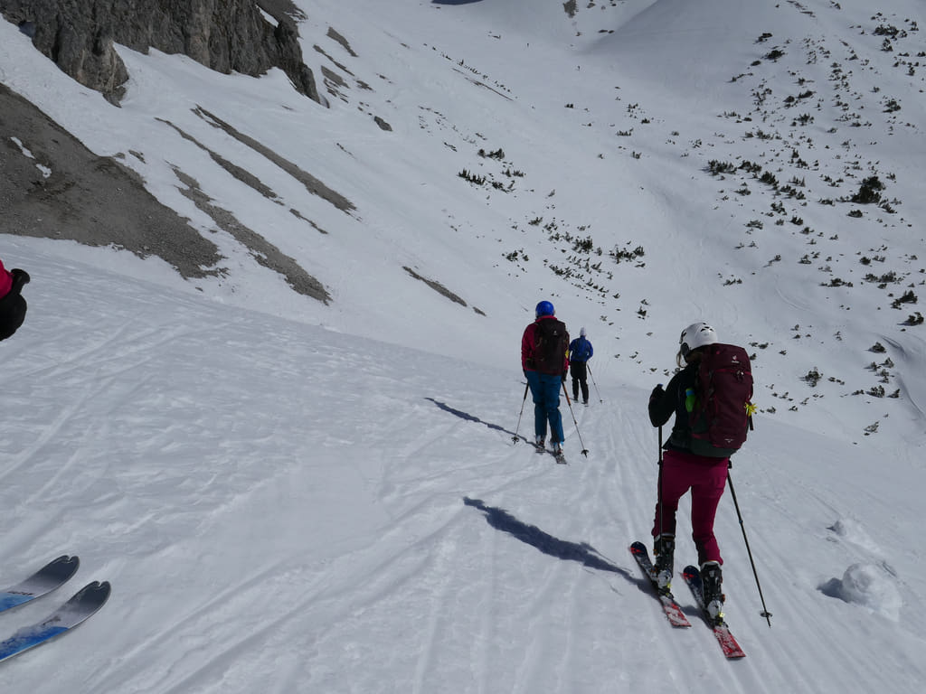 Als wir mit den Marienbergliften bei Biberwier zum Marienbergjoch auffahren ist jeder froh, der vorher seine Daunenjacke angezogen hat. Wieder ist ein strahlender Tag angebrochen. Ein Tourentag wie aus dem Bilderbuch mit Sonne pur und deutlichen Minusgraden. Lawinenwarnstufe 1, was will man mehr. Vom Marienbergjoch steigen wir nach Osten durch das Latschengelände des Arzbödele, unterhalb der Südwände des Grünsteins zum Hölltörl auf, wobei die Harscheisen den Anstieg erleichtern. Hier oben laufen wir schon im strahlenden Sonnenschein und blicken zurück auf die Lechtaler Alpen und hinab ins Inntal, über dem die Ötztaler Alpen herüberleuchten. Vom Hölltörl schwingen wir im Firn durch das Kar ca. 300 Hm hinunter, bei idealer Neigung in die sogenannte Höll. Dieser Ort hat seinen Namen wohl aufgrund der schroffen Kalkwände, die sich hier zu allen Seiten aufsteilen. Wir können hier von Hölle aber nichts wahrnehmen, da wir in der wärmenden Sonne auffellen und über den Felswänden der blaue Himmel strahlt. Nun steigen wir nach Norden die Höllreise hinauf. Ein weites immer steiler werdendes Kar, das schon zur Hölle werden kann, wenn man hier später im Jahr in der Mittagshitze aufsteigt. Auch wir spielen mit dem Gedanken noch eine Schicht auszuziehen, als der zurzeit übliche Ostwind für Kühlung sorgt. Durch dieses Kar erreichen wir die Grünsteinscharte, mit 2272 m der höchste Punkt unserer Tour. Da auf der steilen Nordseite, die wir hinab müssen, abgeschabtes, felsdurchsetztes Gelände ansteht, tragen wir die Skier einige Höhenmeter hinunter, um dann erst unter den Nordabstürzen der westlichen Griesspitze Richtung Tajatörl hinüber zu queren. In kurzer Zeit ist dann bequem das Tajatörl erreicht, wo wir Hans und Anni treffen, die über das Brendlkar aufgestiegen sind. Nach der verdienten Brotzeit fahren wir durchs Brendlkar ab, immer auf der Suche nach unverspurtem Pulverschnee, bis wir das Liftgebiet von Ehrwald erreichen. An der Talstation in der Brent Alm beschließen wir mit Apfel- und Topfenstrudel diesen ausgefüllten Tourentag, um dann mit dem Bus nach Biberwier zurück-zukehren.