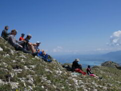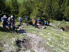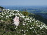 Bei bestem Wetter folgten wir von Lumberg aus dem Weg zum Aggenstein, ließen diesen nach Erreichen der Anhöhe aber links liegen und wendeten uns nach Osten. Den westlichen Gratrücken des Brentenjochs empor folgten wir auf schmalem Pfad dem Tannheimer Höhenweg zur Achsel. Immer wieder an den Abbrüchen der Nordflanke entlang erreichen wir den Gipfel. Zu dieser Jahreszeit blühen hier Aurikel