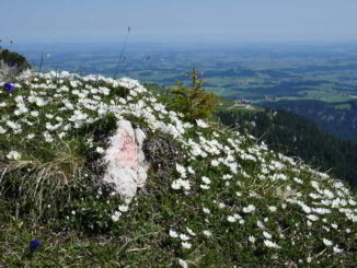 Bei bestem Wetter folgten wir von Lumberg aus dem Weg zum Aggenstein, ließen diesen nach Erreichen der Anhöhe aber links liegen und wendeten uns nach Osten. Den westlichen Gratrücken des Brentenjochs empor folgten wir auf schmalem Pfad dem Tannheimer Höhenweg zur Achsel.  Immer wieder an den Abbrüchen der Nordflanke entlang erreichen wir den Gipfel. Zu dieser Jahreszeit blühen hier Aurikel