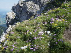 , Mehlprimeln und Stengellose Enziane. Wir hatten Glück, dass wir zur richtigen Zeit am richtigen Ort waren. Schon der Gratrücken und erst recht der Gipfelhang waren übersäht mit einem bunten Teppich dieser Blüten. Nach ausgiebiger Brotzeit folgten wir der Rundtour hinab zum Vilser Jöchle und weiter zur Sebenalpe. Von dort liefen wir gemütlich zurück zu den Autos.