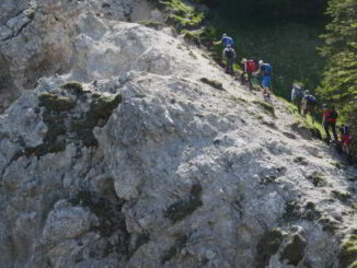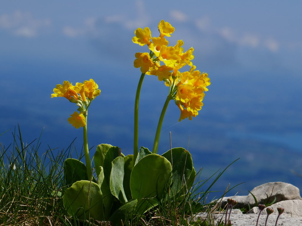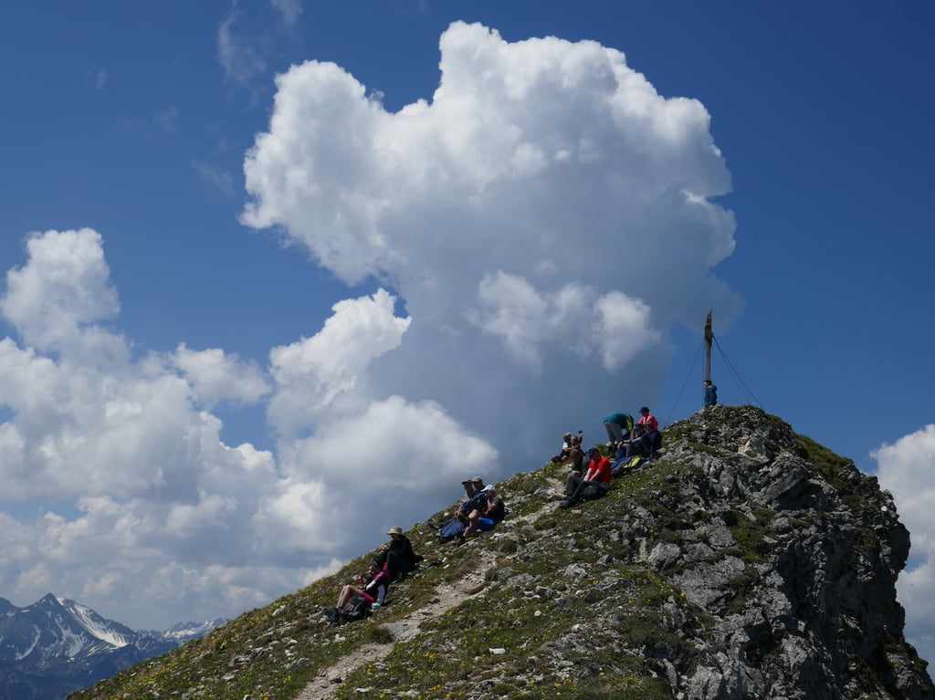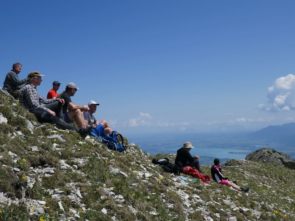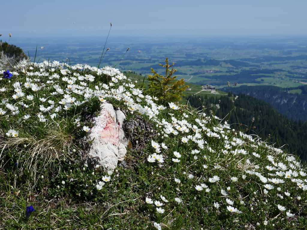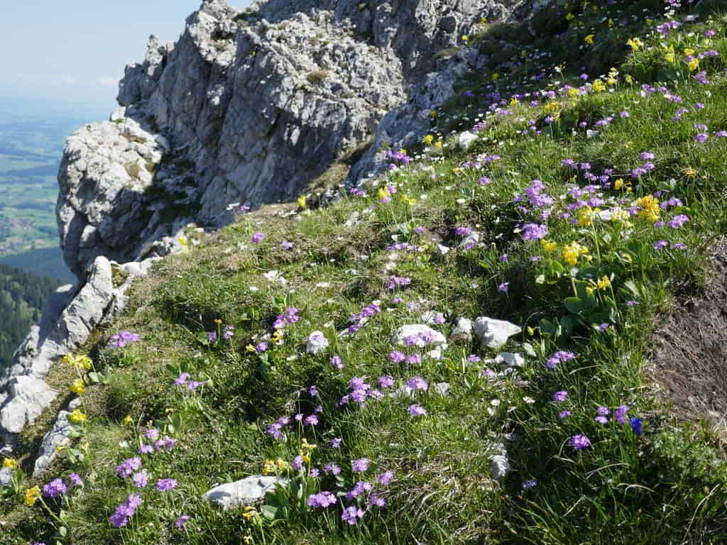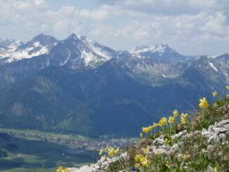 Bei bestem Wetter folgten wir von Lumberg aus dem Weg zum Aggenstein, ließen diesen nach Erreichen der Anhöhe aber links liegen und wendeten uns nach Osten. Den westlichen Gratrücken des Brentenjochs empor folgten wir auf schmalem Pfad dem Tannheimer Höhenweg zur Achsel. Immer wieder an den Abbrüchen der Nordflanke entlang erreichen wir den Gipfel. Zu dieser Jahreszeit blühen hier Aurikel