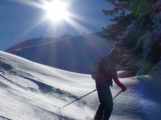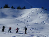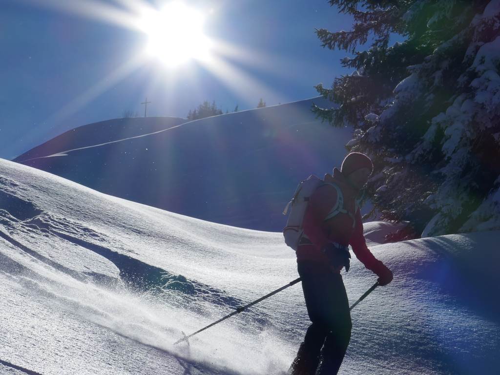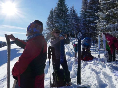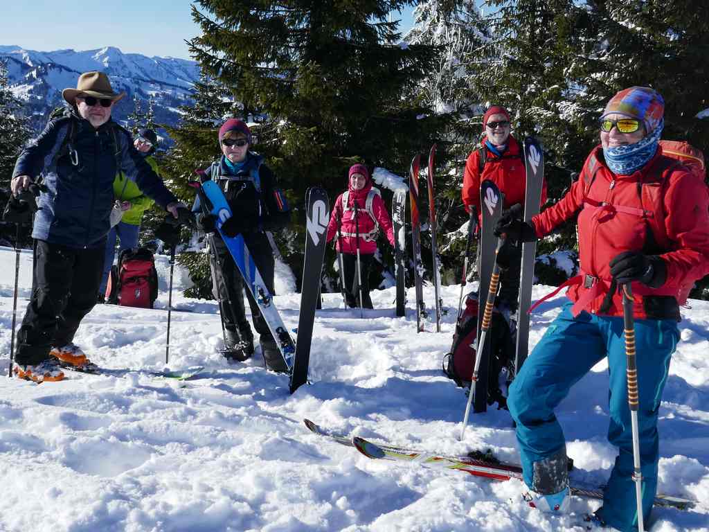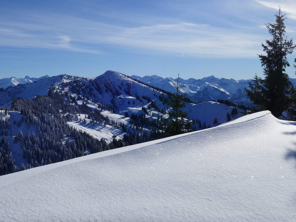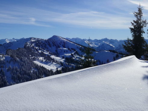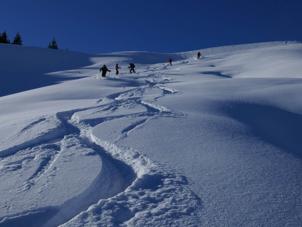 Ein perfekter Tourentag, Schnee und Wetter optimal. Zu siebt starteten wir bei blauem Himmel und ca. – 10° um 8:00 Uhr beim Holler zur Gunzesrieder Säge in der Allgäuer Hörnergruppe. Hier hatte es nur noch – 4°, dennoch brachten wir die ersten 1,5 km auf der Loipe bis zur Vorsäß im Aubachtal zur Aufwärmung flinken Schrittes hinter uns. Nun zweigten wir links ab bergauf auf die Rodelbahn Richtung Alpe Rappengschwend, dann auf einsamerer Spur zur unteren Wilhelminealpe und Richtung Höllritzer Alpe. Die letzten 200 Höhenmeter führten über steilere Nordosthänge zum Gipfel. Ich entschied mich spontan statt Blaicherhorn für den Abfahrtsspuren freien gleich hohen Nachbargipfel, das Höllritzereck. Nach kurzer Pause zum Felle abziehen und Panorama Studium gewannen die Anziehungskräfte der unberührten deep Powder Hänge. Die ersten 300 Abfahrtshöhenmeter in fantastischem, weitgehend unberührtem Pulverschnee waren einfach super. Im Wildbeobachtungshäuschen am Südende des Ostertalberges war dann Schwelgen von der Abfahrt, Felle aufziehen und Brotzeit angesagt. Die nächsten 1,5 km stiegen zwar nur 30 Hm an, waren jedoch am bequemsten mit Fellen zu bewältigen. Ein paar hundert Meter hinter der Birkachalpe hieß es abfellen und nach Norden bei inzwischen etwas weniger Schnee, aber bester Qualität zum Ausgangspunkt ins Tal zu schwingen. Im Café in Blaichach gabs bei Kaffee und Kuchen, noch einen zufriedenen Ratsch über die Tour und alles Mögliche.