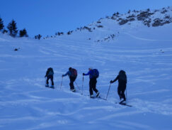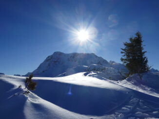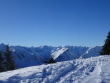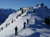 , wo wir über einen steileren Anstieg das Zirleseck erreichten. Das kühle Lüftchen am Grat ließ uns auf der Südseite Zuflucht suchen, wo wir in der Sonne bei unserer Brotzeit die Aussicht auf die Allgäuer Alpen genossen. Obwohl der letzte Schnee schon am Wochenende gefallen war, hatten wir noch beste Abfahrtsbedingungen in glitzerndem Pulverschnee und unvermutet konnten wir noch weitgehend unverspurte Hangpartien finden.