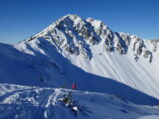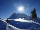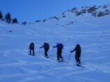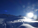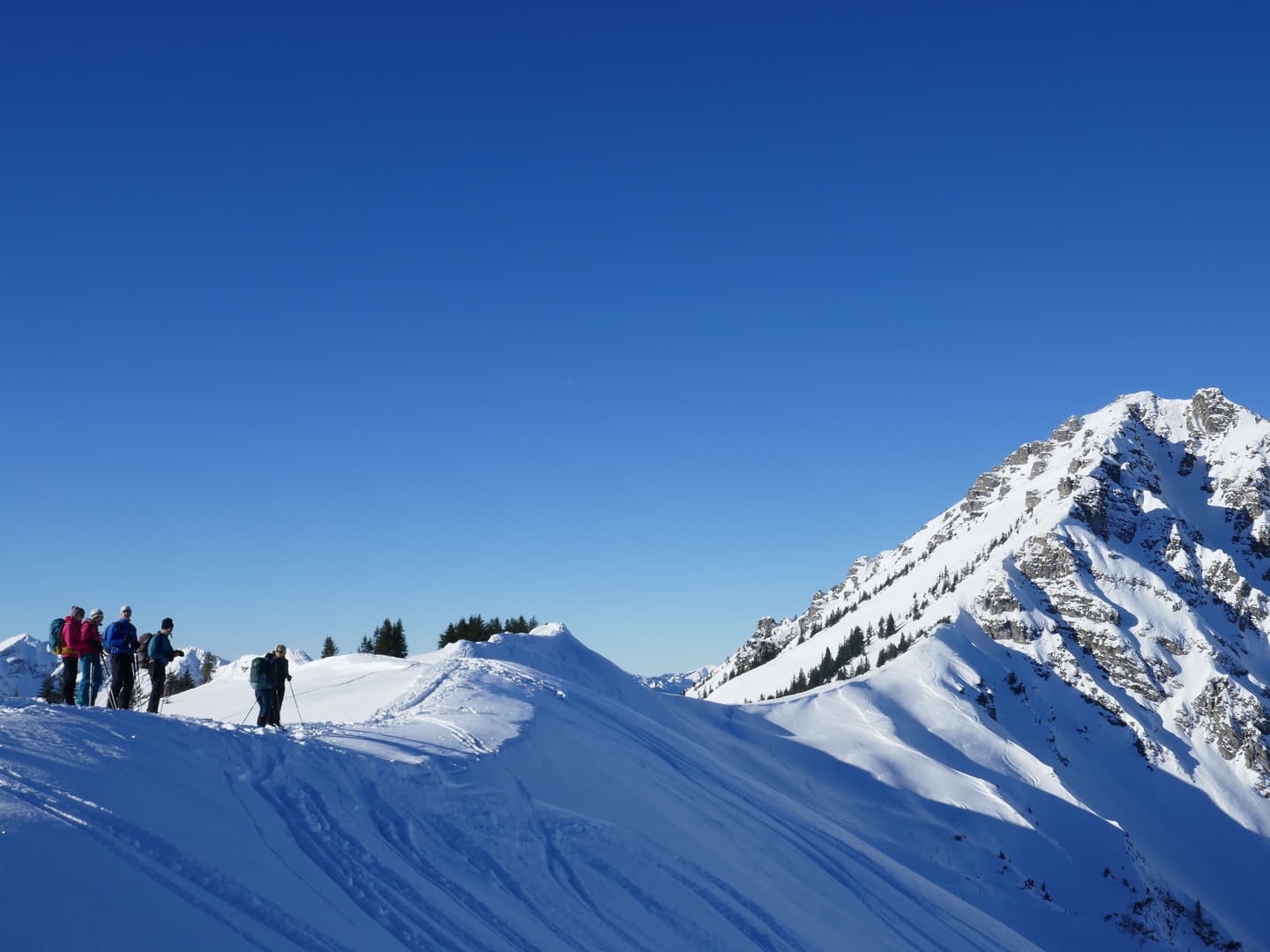 , wo wir über einen steileren Anstieg das Zirleseck erreichten. Das kühle Lüftchen am Grat ließ uns auf der Südseite Zuflucht suchen, wo wir in der Sonne bei unserer Brotzeit die Aussicht auf die Allgäuer Alpen genossen. Obwohl der letzte Schnee schon am Wochenende gefallen war, hatten wir noch beste Abfahrtsbedingungen in glitzerndem Pulverschnee und unvermutet konnten wir noch weitgehend unverspurte Hangpartien finden.