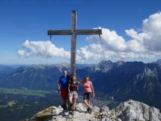 Der folgende felsige Gipfelaufbau von über 300 Hm wurde dann, oft senkrecht hinauf, in netter Kraxelei bezwungen, kurzweilig und nicht zu schwierig (I). Am Gipfel genossen wir die entsprechende Aussicht, wie sie dem östlichen Randgipfel der Wettersteinwand hoch über Mittenwald zukommt. Über 900 Höhenmeter andauernd, mussten wir besonders im Abstieg hochkonzentriert zu Werke gehen, da erst danach unschwierige Wege zum Ferchensee hinunterführen.