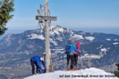 Zahlreiche Testtouren davor zeigten äußerst sparsame bzw. schlechte Schneeverhältnisse, sodass sowohl Tourenski als auch Schneeschuhe zur Wahl standen. Zu fünft bei moderaten Temperaturen und bestem Wetter um 09:00 Uhr am Parkplatz der Sonnenklause 1030 m oberhalb von Hinang angekommen, stiegen zwei auf ihre Tourenski und die anderen in die Schneeschuhe. Über die freien Hänge des „Großen Hofs“, durchsetzt mit etlichen Grünflächen, die unsere Skitourengeher auch kurzzeitig zum Abschnallen nötigten, stiegen wir hinauf zum Dianahüttl 1540 m, wo wir uns eine kurze Trinkpause gönnten. Von hier ging es gemütlich hinauf zum Panoramaweg am Grat „auf der Schnippen“ und jetzt noch 0,5 km nach Südwest auf den Sonnenkopf 1712 m. Dem gut getretenen Panoramaweg weitere 0,5 km folgend erreichten wir den Heidelbeerkopf 1767 m. Ein kalter Wind trieb uns rasch wieder zurück auf den Sonnenkopf, wo wir Brotzeit, Sonnenschein und Panorama genossen. Doch alles hatte ein Ende und unsere Skiläufer wollten uns nun zeigen, dass sie nun ab sofort im Vorteil waren. Wir liefen zurück zum Dianahüttl und wählten ab hier die Route hinunter über den „Kleinen Hof“, welcher im Vergleich zum Aufstieg nördlicher ausgerichtet und schattiger war und dadurch kaum schneefreie Stellen hatte. Lediglich kurz vor der Sonnenklause hieß es in einer 100 Meter Waldpassage noch einmal aufpassen. Insgesamt gesehen war es eine schöne Tour