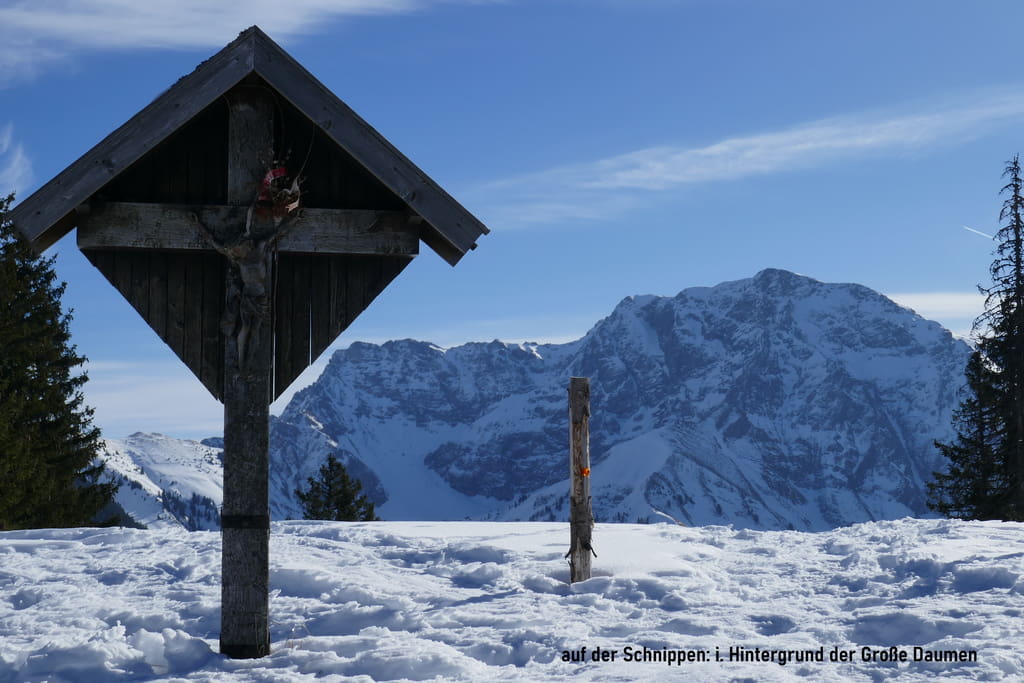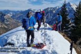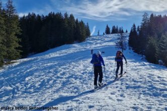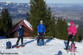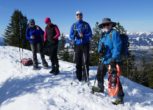 Zahlreiche Testtouren davor zeigten äußerst sparsame bzw. schlechte Schneeverhältnisse, sodass sowohl Tourenski als auch Schneeschuhe zur Wahl standen. Zu fünft bei moderaten Temperaturen und bestem Wetter um 09:00 Uhr am Parkplatz der Sonnenklause 1030 m oberhalb von Hinang angekommen, stiegen zwei auf ihre Tourenski und die anderen in die Schneeschuhe. Über die freien Hänge des „Großen Hofs“, durchsetzt mit etlichen Grünflächen, die unsere Skitourengeher auch kurzzeitig zum Abschnallen nötigten, stiegen wir hinauf zum Dianahüttl 1540 m, wo wir uns eine kurze Trinkpause gönnten. Von hier ging es gemütlich hinauf zum Panoramaweg am Grat „auf der Schnippen“ und jetzt noch 0,5 km nach Südwest auf den Sonnenkopf 1712 m. Dem gut getretenen Panoramaweg weitere 0,5 km folgend erreichten wir den Heidelbeerkopf 1767 m. Ein kalter Wind trieb uns rasch wieder zurück auf den Sonnenkopf, wo wir Brotzeit, Sonnenschein und Panorama genossen. Doch alles hatte ein Ende und unsere Skiläufer wollten uns nun zeigen, dass sie nun ab sofort im Vorteil waren. Wir liefen zurück zum Dianahüttl und wählten ab hier die Route hinunter über den „Kleinen Hof“, welcher im Vergleich zum Aufstieg nördlicher ausgerichtet und schattiger war und dadurch kaum schneefreie Stellen hatte. Lediglich kurz vor der Sonnenklause hieß es in einer 100 Meter Waldpassage noch einmal aufpassen. Insgesamt gesehen war es eine schöne Tour