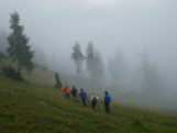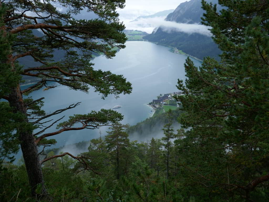 Am ersten Tag nahmen wir uns die Seebergspitze vor, da diese, wie der Name sagt, direkt über dem Achensee aufragt und so mit Tiefblicken auf den Achensee zu rechnen war. Wir starteten auch direkt am Seeufer in Pertisau den Anstieg erst durch steilen Bergwald empor. Schon bald packten wir die Regenbekleidung aus und im Weiteren war das Motto der Tour „Weine nicht wenn der Regen fällt…“. Erstaunlicherweise gaben die Regenwolken immer wieder Tiefblicke auf den Achensee frei und nach fünf Vorgipfeln wurde der Gipfel erreicht. Pünktlich zum Gipfelfoto hörte der Regen für 10 Minuten auf und eine kurze Gipfelbrotzeit war möglich. Als Abstieg wählten wir den steinigen Pfad zum Pasillsattel hinab, wo der Regen aufhörte und wir die weitere Rundtour ohne Regen zu Ende brachten.