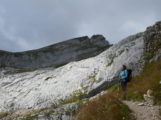 Schrecken konnten uns auch nicht die gewaltigen Ost- und Südwände des Sonnjochs, die annähernd senkrecht aus dem Falzturntal bis zum Gipfel aufsteigen. Im Angesicht der gewaltigen Felskulisse der Karwendelgipfel, zu der ganz nah auch die Lamsenspitze beiträgt, stiegen wir zum Gramaihochleger auf. Ab hier wurde bald klar, dass das Sonnjoch über einen weitflächigen, bröseligen Kalkschild leicht zu besteigen ist, trotz des ansonsten unnahbaren Erscheinungs-bildes. Bis kurz vor 12 Uhr trübten nur einige kleine weiße Wölkchen den blauen Himmel und eine halbe Stunde später war der Himmel fast komplett mit dicken Wolken bedeckt, ein Wetterphänomen, wie man es in der Geschwindigkeit selten beobachtet. So weichte uns dann auch im Abstieg der strömende Regen ordentlich ein, womit das Thema des ersten Tages wieder aufgegriffen war.