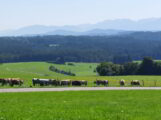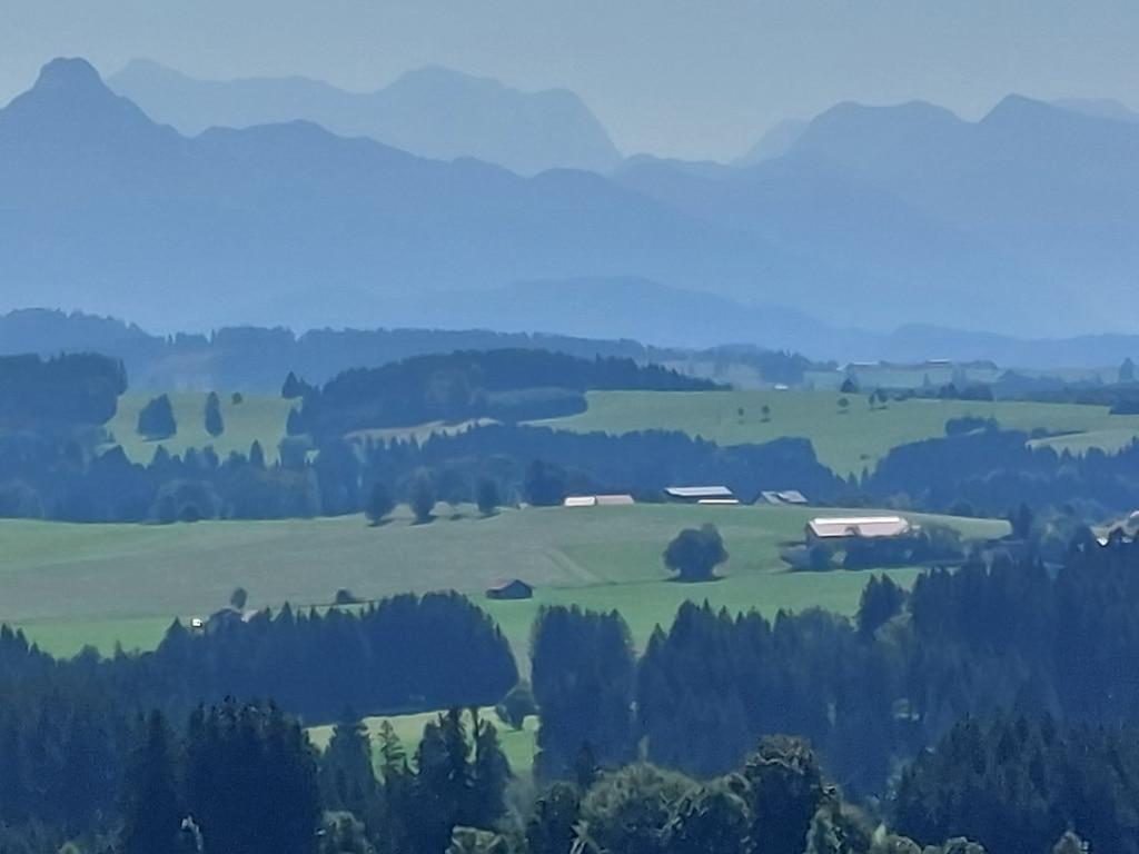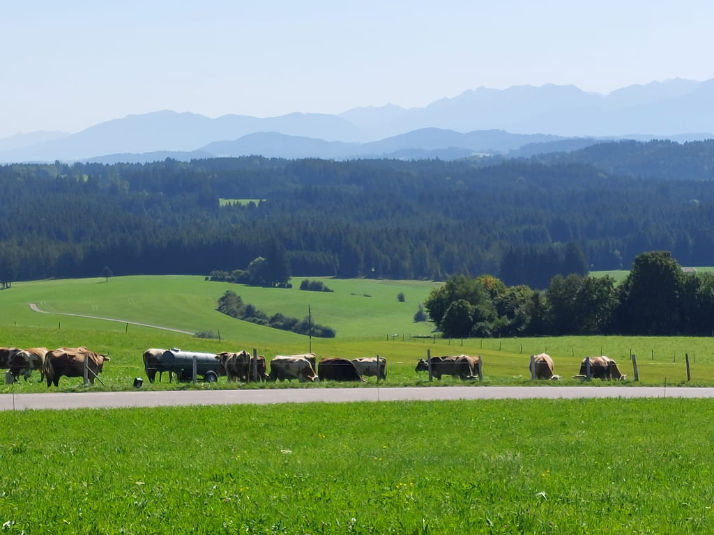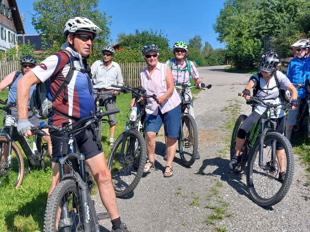 Ab dem Sportplatz in Seeg setzten wir uns auf die Räder und fuhren über Oberreuten zum Kögelweiher. Im Weiler Hertingen wurde vor uns die Strasse wegen Viehtrieb abgesperrt und wir warteten geduldig davor. Der Bauer der anscheinend schon mehrfach schlechte Erfahrungen mit Radlern machte, beschimpfte uns heftig, weil wir eben Radler waren. Durch unser freundliches und besonnenes Verhalten, beruhigte sich der Bauer wieder und wir trennten uns einvernehmlich. Der weitere Weg führte uns von Nesselwang ins Wertachtal und nach einer Holzbrücke und einer kernigen Steigung hinauf zum Wallfahrtsort Maria Rain. Von dort durch die Weiler Stich und Bachtel bis hinauf nach Oberschwarzenberg. Nach kurzer Rast mit herrlichem Panorama genossen wir nun eine 6 km lange Abfahrt nach Görisried. Bis zur Einkehr im Wildberger Hof waren es jetzt nur noch wenige Kilometer auf schattigen Waldwegen in einer recht unbekannten Gegend. Der Heimweg führte auf einer Alternativroute zurück ins Wertachtal