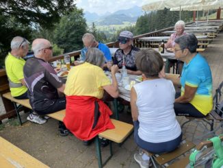 Um 9.00 starteten die Teilnehmer bei strahlendem Sonnenschein beim Holler. Über Helmenstein ging es zunächst nach Roßhaupten wo Klaus sich der Gruppe noch anschloss. Nach Roßhaupten führte die Route nach rechts in den Sulzschneider Forst nach Buchach und von da über die Lohbacher Viehweiden herrlich hinunter nach Seeg und weiter über Roßfallen und Unterhalden zuletzt steil hinauf zur Alpe auf 954 m Höhe. Das Panorama von der Alpe aus ist immer wieder wunderschön. Leider war es etwas dunstig.