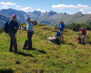 Vom Edelweißhaus in Kaisers stiegen wir zu sechst bei bestem Bergwetter am Muttekopf vorbei hinauf zum Westgrat der Rotschrofenspitze. Ab dem Rotschrofenkopf wiesen nur noch Trittspuren über Steilgras und Felsschrofen entlang der Nordabbrüche sehr luftig zum Gipfel. Hier sind Schwindelfreiheit und absolute Trittsicherheit Voraussetzung. Am Gipfelkreuz belohnten uns Brotzeit und eine fantastische Aussicht. Danach ging es noch einmal hochkonzentriert über den teilweise ausgesetzten Südgrat hinunter ins Falmedonjoch. Der weitere Abstieg führte dann gemütlich über den Wilden Kaiser zurück nach Kaisers.