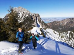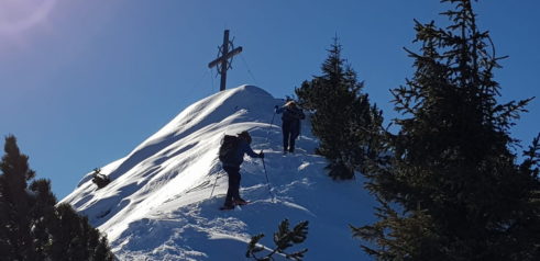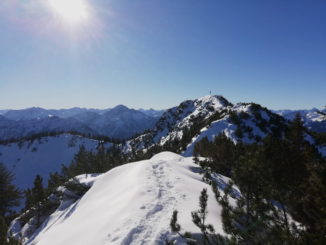 Trotz Kaiserwetter blieben wir ein überschaubares Grüppchen, was unsere Stimmung aber keineswegs trübte. Warm eingepackt marschierten wir zügig bei -5° vom Säulingparkplatz bei Pflach los, doch schon bald konnten wir diverse Kleidungsstücke wieder im Rucksack verstauen. Bei der Weggabelung hielten wir uns rechts zum Pflacher Älpele, wo uns eine sonnige Bank zu einer kurzen Rast einlud, bevor wir den steilen Hang zum Grat aufstiegen. Hier oben öffnete sich der Blick auch auf weniger frequentierte Gipfel wie Schlagstein, Zunder-, Ochsenälpeles- und Kreuzkopf. Dem Gratverlauf folgend und nach einigen Ups and Downs erreichten wir den Gipfel mit fantastischen Rundblick.