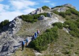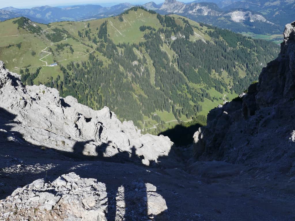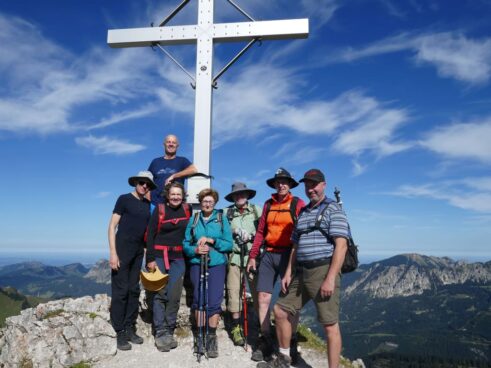 , stiegen wir erst kurz weglos, dann auf Pfadspuren südlich der Strindenschartenköpfe zur Kammhöhe empor. Hier kamen wir in die angenehme Herbstsonne, so dass wir nun sommerlich angezogen dem herrlichen Höhenweg folgen konnten. So trafen wir bald auf den Normalweg, der mit Stahlseilen versichert zum Gipfel führt. Eigentlich rechneten wir mit weniger Leuten am Gipfel, aber die Marktoberdorfer hatten die gleiche Alpenvereinstour am gleichen Tag im Programm und so mussten wir uns den Gipfel teilen. Trotzdem genossen wir in Ruhe die Rundsicht auf u.a. Tannheimer Berge und Lechtaler Alpen. Der Abstieg erfolgte über den Normalweg hinunter zur Gräner Ödenalpe, an der wir nicht vorbeilaufen konnten ohne einzukehren. Von hier ging es hinab ins Strindental und zurück zum Ausgangspunkt.