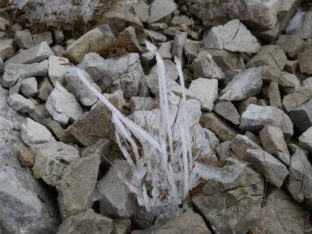 Gemäß unserem Motto „ Wir gehen fast bei jedem Wetter“ starteten wir bei ziemlich bewölktem Himmel. Erst querten wir das trockene Bachbett, stapften durch lichten Wald, durch Latschen-Krummholz, kämpften uns das Hochgrießkar hinauf, ließen das Schwarzenköpfl links liegen und erreichten alsbald den felsigen Gipfelaufschwung der Kreuzspitze. Raureif am eiskalten Fels ließ die Finger ganz schön klamm werden, wohl dem, der Handschuhe im Gepäck hatte. Aber die Kälte war nicht von langer Dauer, denn am Gipfel lachte schon die Sonne.