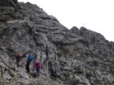 Nun begann der spannendere Teil unserer Unternehmung. Nach kurzer Pause balancierten wir einen kleinen Grat hinüber (für Gratliebhaber ein echtes Schmankerl!) zur seilversicherten Abkletterstelle, stiegen wieder hoch zur luftigen Kante, an der wir eine geraume Zeit entlang wanderten und genossen hier ein Schauspiel der besonderen Art. Aufziehender Nebel und Sonnenschein wechselten in atemberaubenden Tempo und ließen Geschichten über Feen und Berggeister wahr werden.