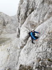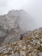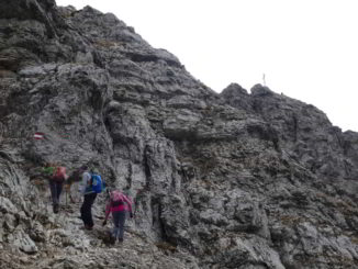 Bröseliges Gestein erforderte dann beim Abstieg erhöhte Konzentration wie auch die 2er Kletterstelle, die zu guter Letzt noch zu bewältigen war. Nun war es geschafft und uns trennte nur noch ein grasiger Aufschwung vom Gipfel des Kreuzspitzl, wo wir uns nun ganz entspannt unsere Brotzeit schmecken ließen.