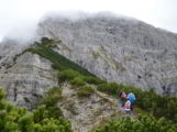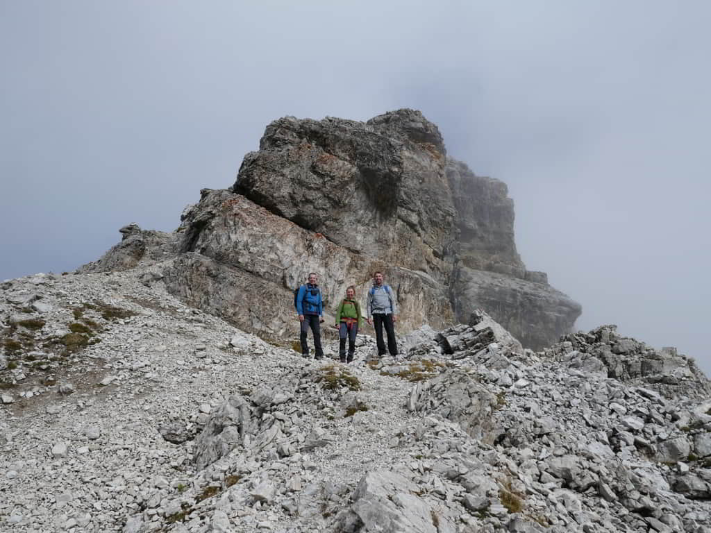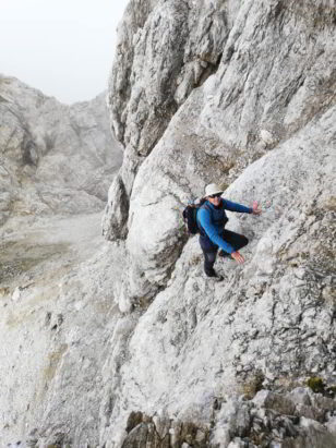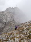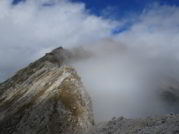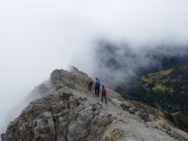Nun begann der spannendere Teil unserer Unternehmung. Nach kurzer Pause balancierten wir einen kleinen Grat hinüber (für Gratliebhaber ein echtes Schmankerl!) zur seilversicherten Abkletterstelle, stiegen wieder hoch zur luftigen Kante, an der wir eine geraume Zeit entlang wanderten und genossen hier ein Schauspiel der besonderen Art. Aufziehender Nebel und Sonnenschein wechselten in atemberaubenden Tempo und ließen Geschichten über Feen und Berggeister wahr werden.