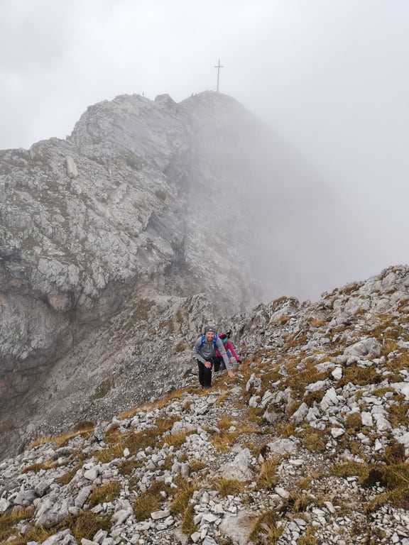 Gemäß unserem Motto „ Wir gehen fast bei jedem Wetter“ starteten wir bei ziemlich bewölktem Himmel. Erst querten wir das trockene Bachbett, stapften durch lichten Wald, durch Latschen-Krummholz, kämpften uns das Hochgrießkar hinauf, ließen das Schwarzenköpfl links liegen und erreichten alsbald den felsigen Gipfelaufschwung der Kreuzspitze. Raureif am eiskalten Fels ließ die Finger ganz schön klamm werden, wohl dem, der Handschuhe im Gepäck hatte. Aber die Kälte war nicht von langer Dauer, denn am Gipfel lachte schon die Sonne.