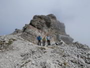 Bröseliges Gestein erforderte dann beim Abstieg erhöhte Konzentration wie auch die 2er Kletterstelle, die zu guter Letzt noch zu bewältigen war. Nun war es geschafft und uns trennte nur noch ein grasiger Aufschwung vom Gipfel des Kreuzspitzl, wo wir uns nun ganz entspannt unsere Brotzeit schmecken ließen.
