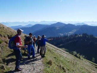 , sondern im sonnigen Süden laufen wir also auf einfachen Wegen zuerst zur Oberen Gelchenwangalpe, vorbei an herbstlich verfärbten Buchen und Bergahorn-bäumen, die zum blauen Himmel kontrastieren. Da die moderate Tour viel Zeit lässt, bleiben wir immer wieder stehen um das Bergpanorama zu studieren. In den Tälern Richtung Westen und Norden liegen die Nebel und darüber erheben sich u.a. Säntis und Schesaplana, sowie natürlich die gesamte Kette der zentralen Allgäuer Alpen. Weit nach Westen ausholend steigen wir dann zum Gipfelkreuz des Hochgrat empor. Nachdem wir am Gipfel im T-Shirt sitzend die wärmende Sonne genossen haben