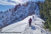 Zahlreiche Testtouren davor zeigten äußerst sparsame bzw. schlechte Schneeverhältnisse, sodass sowohl Tourenski als auch Schneeschuhe zur Wahl standen. Zu fünft bei moderaten Temperaturen und bestem Wetter um 09:00 Uhr am Parkplatz der Sonnenklause 1030 m oberhalb von Hinang angekommen, stiegen zwei auf ihre Tourenski und die anderen in die Schneeschuhe. Über die freien Hänge des „Großen Hofs“, durchsetzt mit etlichen Grünflächen, die unsere Skitourengeher auch kurzzeitig zum Abschnallen nötigten, stiegen wir hinauf zum Dianahüttl 1540 m, wo wir uns eine kurze Trinkpause gönnten. Von hier ging es gemütlich hinauf zum Panoramaweg am Grat „auf der Schnippen“ und jetzt noch 0,5 km nach Südwest auf den Sonnenkopf 1712 m. Dem gut getretenen Panoramaweg weitere 0,5 km folgend erreichten wir den Heidelbeerkopf 1767 m. Ein kalter Wind trieb uns rasch wieder zurück auf den Sonnenkopf, wo wir Brotzeit, Sonnenschein und Panorama genossen. Doch alles hatte ein Ende und unsere Skiläufer wollten uns nun zeigen, dass sie nun ab sofort im Vorteil waren. Wir liefen zurück zum Dianahüttl und wählten ab hier die Route hinunter über den „Kleinen Hof“, welcher im Vergleich zum Aufstieg nördlicher ausgerichtet und schattiger war und dadurch kaum schneefreie Stellen hatte. Lediglich kurz vor der Sonnenklause hieß es in einer 100 Meter Waldpassage noch einmal aufpassen. Insgesamt gesehen war es eine schöne Tour