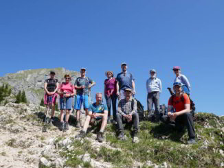 Bei bestem Wetter folgten wir von Lumberg aus dem Weg zum Aggenstein, ließen diesen nach Erreichen der Anhöhe aber links liegen und wendeten uns nach Osten. Den westlichen Gratrücken des Brentenjochs empor folgten wir auf schmalem Pfad dem Tannheimer Höhenweg zur Achsel. Immer wieder an den Abbrüchen der Nordflanke entlang erreichen wir den Gipfel. Zu dieser Jahreszeit blühen hier Aurikel