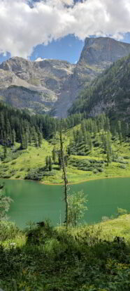 Unser Ziel am 1.Tag war das Kärlingerhaus am Funtensee über den Sägereggsteig. Es war sehr heiß und der Weg war durch hohe Tritte und einige Seile anspruchsvoll. Unterwegs hielten wir am wunderschönen Grünsee an, und einige kühlten sich durch ein erfrischendes Bad ab.