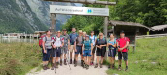 Am Sonntag, den 13.08. starteten wir unsere 4-tägige Tour in Lechbruck. Wir fuhren zu elft an den Königssee und lösten dort Tickets nach Salet. Auf der Fahrt hatten wir einen tollen Blick auf den Watzmann und die „schlafende Hexe“. Auf etwa halber Fahrtstrecke nach St. Bartholomä wurde uns mit der Trompete vom Bootsführer das Echo an der Wand demonstriert.