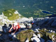 Der folgende felsige Gipfelaufbau von über 300 Hm wurde dann, oft senkrecht hinauf, in netter Kraxelei bezwungen, kurzweilig und nicht zu schwierig (I). Am Gipfel genossen wir die entsprechende Aussicht, wie sie dem östlichen Randgipfel der Wettersteinwand hoch über Mittenwald zukommt. Über 900 Höhenmeter andauernd, mussten wir besonders im Abstieg hochkonzentriert zu Werke gehen, da erst danach unschwierige Wege zum Ferchensee hinunterführen.