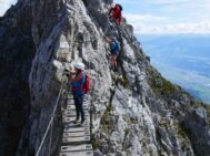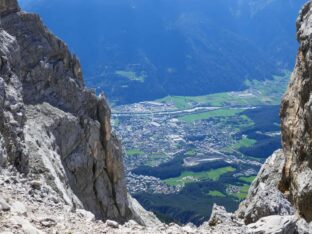 Es war erst einmal Geduld angesagt, weil sich an der B/C – Stelle beim Anstieg zur Seegrubenspitze ein Stau gebildet hatte (Sonntag und schönes Wetter). Noch wehte ein frischer Wind, so dass wir froh waren nach einer halben Stunde endlich einsteigen zu dürfen. Vor dem Anstieg zu den Kaminspitzen machte dann eine große Gruppe Jugendlicher mit ihren Führern Pause, so dass wir überholen konnten und damit die Staugefahr gebannt war. Zum Weiterweg zitiere ich den Rotherführer „…vom ersten bis zum letzten Seil ein Klettersteiggenuss der gehobenen Klasse – einer der schönsten gesicherten Höhenwege der Ostalpen.“ Dem stimmt man natürlich gerne zu, zumal man immer mit bestem Panorama unterhalten wird, hoch über dem Inntal. So kletterten wir kurzweilig vor uns hin und waren viel mit Umhängen beschäftigt, da im ersten Teil des Klettersteigs ca. 500 Haken zu überbrücken sind. Nach etwa 3 Stunden hatten wir den höchsten Punkt, den Kemacher, erreicht und stiegen gleich hinab in den langen Sattel, wo wir nach 3 ½ h Kletterei Brotzeit machten.