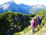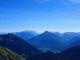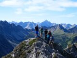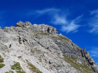 , stiegen wir erst kurz weglos, dann auf Pfadspuren südlich der Strindenschartenköpfe zur Kammhöhe empor. Hier kamen wir in die angenehme Herbstsonne, so dass wir nun sommerlich angezogen dem herrlichen Höhenweg folgen konnten. So trafen wir bald auf den Normalweg, der mit Stahlseilen versichert zum Gipfel führt. Eigentlich rechneten wir mit weniger Leuten am Gipfel, aber die Marktoberdorfer hatten die gleiche Alpenvereinstour am gleichen Tag im Programm und so mussten wir uns den Gipfel teilen. Trotzdem genossen wir in Ruhe die Rundsicht auf u.a. Tannheimer Berge und Lechtaler Alpen. Der Abstieg erfolgte über den Normalweg hinunter zur Gräner Ödenalpe, an der wir nicht vorbeilaufen konnten ohne einzukehren. Von hier ging es hinab ins Strindental und zurück zum Ausgangspunkt.