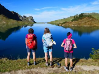 , wobei wir einen herrlichen Blick auf den tiefblauen See hatten, in dem sich die Gipfel spiegelten.  Moderat erreichten wir die Lahnerscharte und liefen damit ein kurzes Stück den Jubiläumsweg
