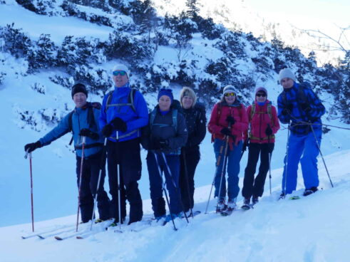 , wo wir über einen steileren Anstieg das Zirleseck erreichten. Das kühle Lüftchen am Grat ließ uns auf der Südseite Zuflucht suchen, wo wir in der Sonne bei unserer Brotzeit die Aussicht auf die Allgäuer Alpen genossen. Obwohl der letzte Schnee schon am Wochenende gefallen war, hatten wir noch beste Abfahrtsbedingungen in glitzerndem Pulverschnee und unvermutet konnten wir noch weitgehend unverspurte Hangpartien finden.