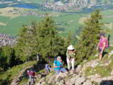 Auf Grund der Prognose um die 30° Celsius und nachmittags Gewitter starteten wir für unsere relativ sanfte Tour zu sechst bereits um ca. 07:00 Uhr am Gh Holler. Vom Parkplatz „An der Halde“ in Burgberg nahmen wir den Grüntenwaldweg und zweigten auf 1140 m nach links in den Funkenweg, der uns direkt in die Südflanke des Hörnles führte. Nach oben hin wurde der Steig immer felsiger, so dass man immer mehr die Hände zur Stabilisation und die Augen zur Ortung der optimalen Route brauchte. Den Gipfel hatten wir dann weitgehend für uns allein. Nach kurzer Rast unterstützte uns ein Drahtseil über eine scharfe Gratschneide zu einem ausgeprägten Sattel, der uns sanft zum Grüntenhaus leitete. Hier regelten wir unter schattenspendenden Ahornbäumen unsere Defizite an Kalorien und Flüssigkeit. Über den Stuhlwandsattel führte dann der Abstieg vorbei an mittlerer Schwand-, Kehralpe und Gasthof Alpenblick zurück zum Parkplatz. Gewitter kam keines, doch die Temperaturen kletterten maßlos in den sonnigen windstillen Südhängen des Grünten, dass die Schweißperlen von der Stirn bis in die Schuhe rollten. So ließ sich ein weiterer Stopp in der Jagdhütte Geißstadl, Kranzegg als Tourenausklang nicht vermeiden.