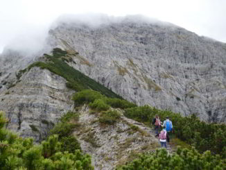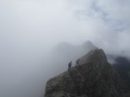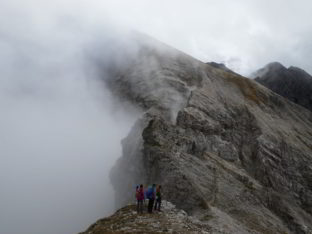 Nun begann der spannendere Teil unserer Unternehmung. Nach kurzer Pause balancierten wir einen kleinen Grat hinüber (für Gratliebhaber ein echtes Schmankerl!) zur seilversicherten Abkletterstelle, stiegen wieder hoch zur luftigen Kante, an der wir eine geraume Zeit entlang wanderten und genossen hier ein Schauspiel der besonderen Art. Aufziehender Nebel und Sonnenschein wechselten in atemberaubenden Tempo und ließen Geschichten über Feen und Berggeister wahr werden.