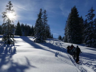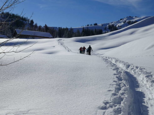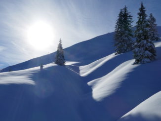 Ein perfekter Tourentag, Schnee und Wetter optimal. Zu siebt starteten wir bei blauem Himmel und ca. – 10° um 8:00 Uhr beim Holler zur Gunzesrieder Säge in der Allgäuer Hörnergruppe. Hier hatte es nur noch – 4°, dennoch brachten wir die ersten 1,5 km auf der Loipe bis zur Vorsäß im Aubachtal zur Aufwärmung flinken Schrittes hinter uns. Nun zweigten wir links ab bergauf auf die Rodelbahn Richtung Alpe Rappengschwend, dann auf einsamerer Spur zur unteren Wilhelminealpe und Richtung Höllritzer Alpe. Die letzten 200 Höhenmeter führten über steilere Nordosthänge zum Gipfel. Ich entschied mich spontan statt Blaicherhorn für den Abfahrtsspuren freien gleich hohen Nachbargipfel, das Höllritzereck. Nach kurzer Pause zum Felle abziehen und Panorama Studium gewannen die Anziehungskräfte der unberührten deep Powder Hänge. Die ersten 300 Abfahrtshöhenmeter in fantastischem, weitgehend unberührtem Pulverschnee waren einfach super. Im Wildbeobachtungshäuschen am Südende des Ostertalberges war dann Schwelgen von der Abfahrt, Felle aufziehen und Brotzeit angesagt. Die nächsten 1,5 km stiegen zwar nur 30 Hm an, waren jedoch am bequemsten mit Fellen zu bewältigen. Ein paar hundert Meter hinter der Birkachalpe hieß es abfellen und nach Norden bei inzwischen etwas weniger Schnee, aber bester Qualität zum Ausgangspunkt ins Tal zu schwingen. Im Café in Blaichach gabs bei Kaffee und Kuchen, noch einen zufriedenen Ratsch über die Tour und alles Mögliche.
