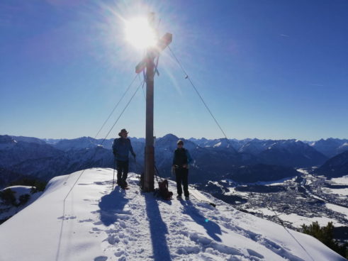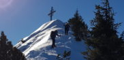 Trotz Kaiserwetter blieben wir ein überschaubares Grüppchen, was unsere Stimmung aber keineswegs trübte. Warm eingepackt marschierten wir zügig bei -5° vom Säulingparkplatz bei Pflach los, doch schon bald konnten wir diverse Kleidungsstücke wieder im Rucksack verstauen. Bei der Weggabelung hielten wir uns rechts zum Pflacher Älpele, wo uns eine sonnige Bank zu einer kurzen Rast einlud, bevor wir den steilen Hang zum Grat aufstiegen. Hier oben öffnete sich der Blick auch auf weniger frequentierte Gipfel wie Schlagstein, Zunder-, Ochsenälpeles- und Kreuzkopf. Dem Gratverlauf folgend und nach einigen Ups and Downs erreichten wir den Gipfel mit fantastischen Rundblick.