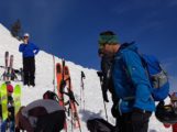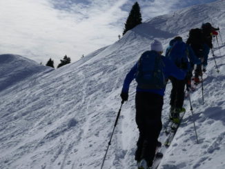 Wir starteten zu acht in Kammeregg 1000 m nahe Kranzegg bei blauem Himmel und ca. – 5° um 9:00 Uhr Richtung Kammeregg Alpe 1130 m. Während der ersten 100 Hm bedurfte es pfadfinderischer Fähigkeiten, um die richtigen Schneisen mit ausreichend Schnee zu wählen. Ab der Alpe war die Schneedecke dann locker ausreichend und mit 10 cm Pulverschnee bedeckt. So zogen wir unsere Spur gemütlich hinauf zum Nordostrücken des Grünten und weiter zum Südostgrat des Gipfelhanges. Knapp unter 1700 m deponierten wir unsere Ski und zogen Grödel bzw. Steigeisen unter die Skistiefel, denn ein Ausrutscher wäre im steilen, eisigen und ausgesetzten Gipfelanstieg fatal gewesen. Nach Brotzeit und Panoramastudium stiegen wir wieder ab zum Skidepot und freuten uns bereits auf den vor uns liegenden Pulverschnee. Nach einer ganzen Reihe kaum verspurter Hänge kehrten wir ganz happy zum Abschluss auf der Terrasse der Kammeregg Alpe noch ein. Wir waren mit der Tour sehr zufrieden, trotz der nicht ganz einfachen Verhältnisse dieses Winters.