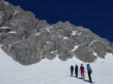 Als wir mit den Marienbergliften bei Biberwier zum Marienbergjoch auffahren ist jeder froh, der vorher seine Daunenjacke angezogen hat. Wieder ist ein strahlender Tag angebrochen. Ein Tourentag wie aus dem Bilderbuch mit Sonne pur und deutlichen Minusgraden. Lawinenwarnstufe 1, was will man mehr. Vom Marienbergjoch steigen wir nach Osten durch das Latschengelände des Arzbödele, unterhalb der Südwände des Grünsteins zum Hölltörl auf, wobei die Harscheisen den Anstieg erleichtern. Hier oben laufen wir schon im strahlenden Sonnenschein und blicken zurück auf die Lechtaler Alpen und hinab ins Inntal, über dem die Ötztaler Alpen herüberleuchten. Vom Hölltörl schwingen wir im Firn durch das Kar ca. 300 Hm hinunter, bei idealer Neigung in die sogenannte Höll. Dieser Ort hat seinen Namen wohl aufgrund der schroffen Kalkwände, die sich hier zu allen Seiten aufsteilen. Wir können hier von Hölle aber nichts wahrnehmen, da wir in der wärmenden Sonne auffellen und über den Felswänden der blaue Himmel strahlt. Nun steigen wir nach Norden die Höllreise hinauf. Ein weites immer steiler werdendes Kar, das schon zur Hölle werden kann, wenn man hier später im Jahr in der Mittagshitze aufsteigt. Auch wir spielen mit dem Gedanken noch eine Schicht auszuziehen, als der zurzeit übliche Ostwind für Kühlung sorgt. Durch dieses Kar erreichen wir die Grünsteinscharte, mit 2272 m der höchste Punkt unserer Tour. Da auf der steilen Nordseite, die wir hinab müssen, abgeschabtes, felsdurchsetztes Gelände ansteht, tragen wir die Skier einige Höhenmeter hinunter, um dann erst unter den Nordabstürzen der westlichen Griesspitze Richtung Tajatörl hinüber zu queren. In kurzer Zeit ist dann bequem das Tajatörl erreicht, wo wir Hans und Anni treffen, die über das Brendlkar aufgestiegen sind. Nach der verdienten Brotzeit fahren wir durchs Brendlkar ab, immer auf der Suche nach unverspurtem Pulverschnee, bis wir das Liftgebiet von Ehrwald erreichen. An der Talstation in der Brent Alm beschließen wir mit Apfel- und Topfenstrudel diesen ausgefüllten Tourentag, um dann mit dem Bus nach Biberwier zurück-zukehren.