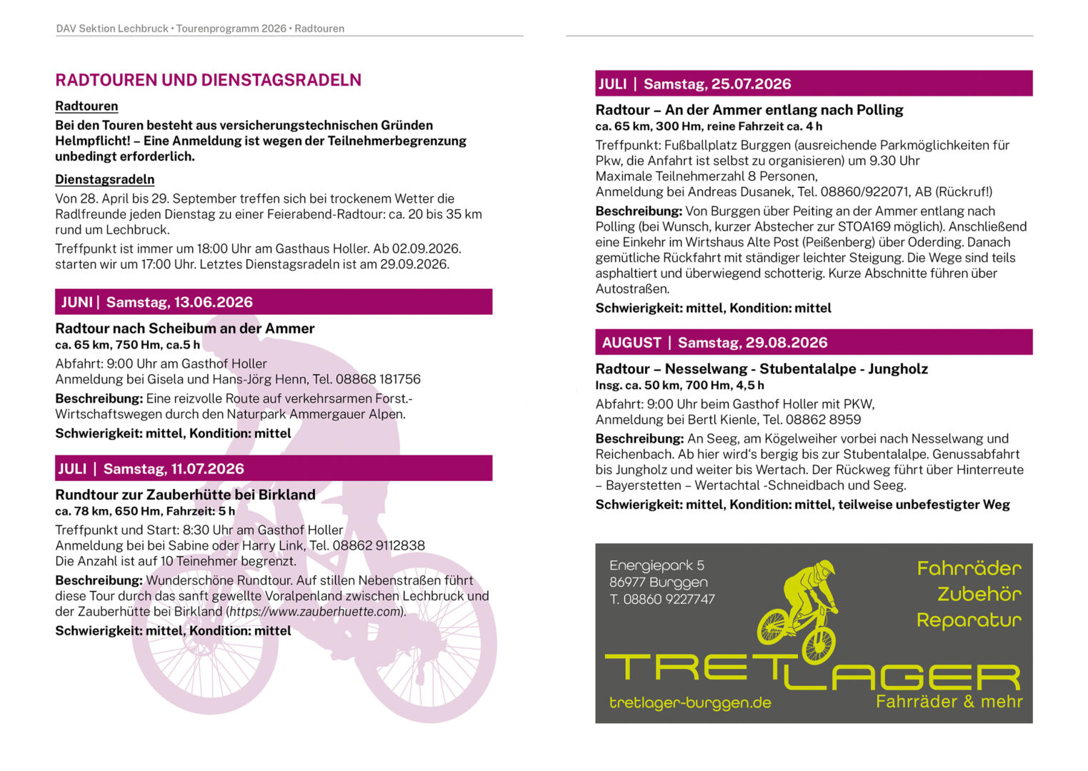Die Sektion Lechbruck am See bietet eintägige oder auch mehrtägige Radtouren an. Unsere Tagesetappen liegen zwischen ca. 40 und 100 km. Unser Motto soll lauten: „Sportliches Genussradfahren – egal ob mit Trekkingrad, E-Bike oder Mountainbike. Jeder ist herzlich willkommen.“ Wir wollen gemeinsam und ohne Gruppenzwang auf Rad- und Forstwegen unsere schöne Natur mit dem Rad erkunden. Neben den Tagestouren treffen wir uns von Mai bis Oktober jeden Dienstag zum „Dienstags-Radeln“- ca. 2 Stunden – rund um Lechbruck. Treffpunkt ist ab dem 28.04.2026 immer um 18:00 Uhr am Gasthaus Holler. Ab 02.09.2026 starten wir bereits um 17:00 Uhr. Letztes Dienstagsradeln ist am 29.09.2026.